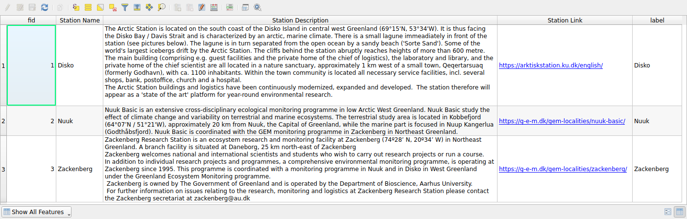 temperature attributename attributepopulation attributeAttribute table for the “Human activity/Research sites/GEM research stations” point layer in QGreenland